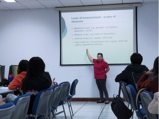 在授课过程中,Dorota Witkowska教授向同学们介绍了社会经济学研究的度量方法并以波兰为例介绍了经济单位的比较研究方法。Krzysztof Kompa教授进一步指出应基于调查目的、研究问题以及研究对象自身的特点选择研究方法,并讲解了如何对国家的主要特征进行描述,进而以教育、居住条件、医疗卫生、环境保护领域为例,向同学们推荐了各领域文献和数据查找常用的网站。随后,两位教授列举了捷克斯洛伐克共和国、波兰、俄罗斯等国的GDP、私人消费、货物和服务的进出口等指标,为同学们讲解比较分析方法。同学们通过分组讨论学习,搜集中国和OECD国家的相关数据,并在两位教授的指导下进行实践操作,掌握了一系列数据处理方法,包括计算最值和方差、筛选有效数据、计算国家间的距离矩阵、对数据进行正态化处理、计算SMR值等数据处理方法。
