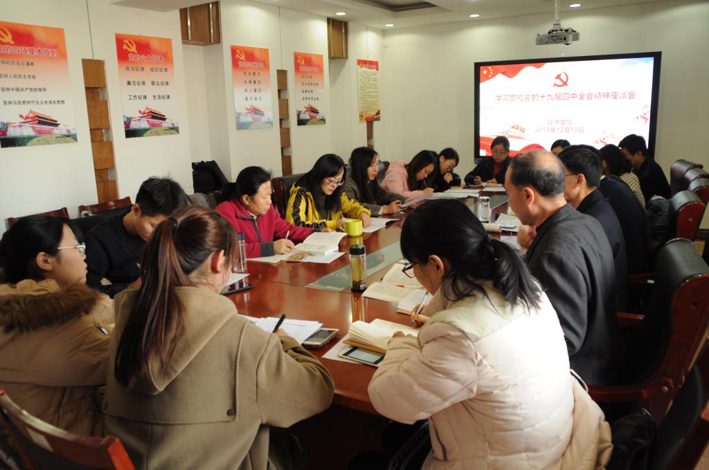 (通讯员:李冰封王佳敏孙俏俏)2019年12月18日下午,新葡的京集团350vip在舜耕校区办公楼1208召开学习贯彻党的十九届四中全会精神座谈会。新葡的京集团350vip党委书记姜伟,院长董长瑞,党委副书记高峰,支部书记代表、辅导员代表、教授代表、民主党派代表、青年教师代表、学生党团员代表出席座谈会。会议由姜伟主持。