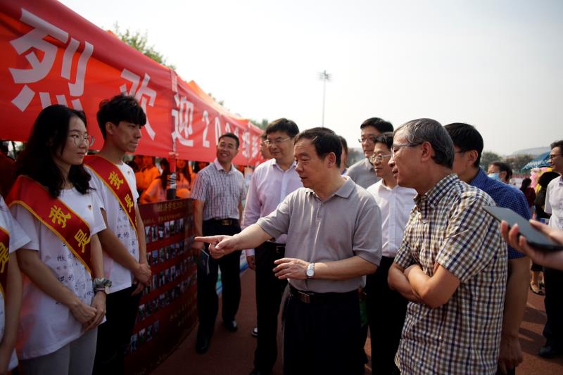 校党委书记王邵军、校长赵忠秀在学校相关部门陪同下莅临新葡的京集团迎新现场,浏览学院迎新宣传板,询问学生报到情况,对新葡的京集团迎新工作、党员服务岗的设立和现场宣传给予肯定。