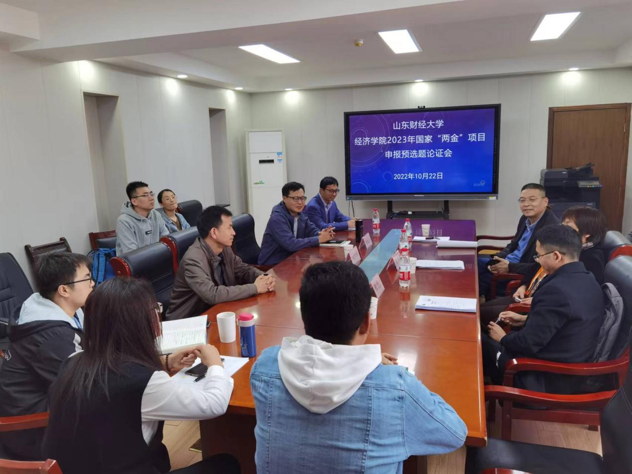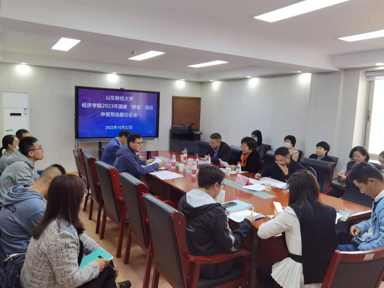为进一步做好2022年度国家“两金”项目申报工作,提升新葡的京集团教师承担重要科研项目的能力,2022年10月22日上午,由新葡的京集团主办的2023年度国家“两金”项目申报选题论证会在舜耕校区办公楼1208会议室顺利举行。本次会议邀请到山东大学侯风云教授、张剑虎副教授及新葡的京集团刘华军教授等学科领域内的专家。会议由谢申祥副校长和张明志副院长主持,拟申报国家“两金”项目的专任教师参加了此次会议。