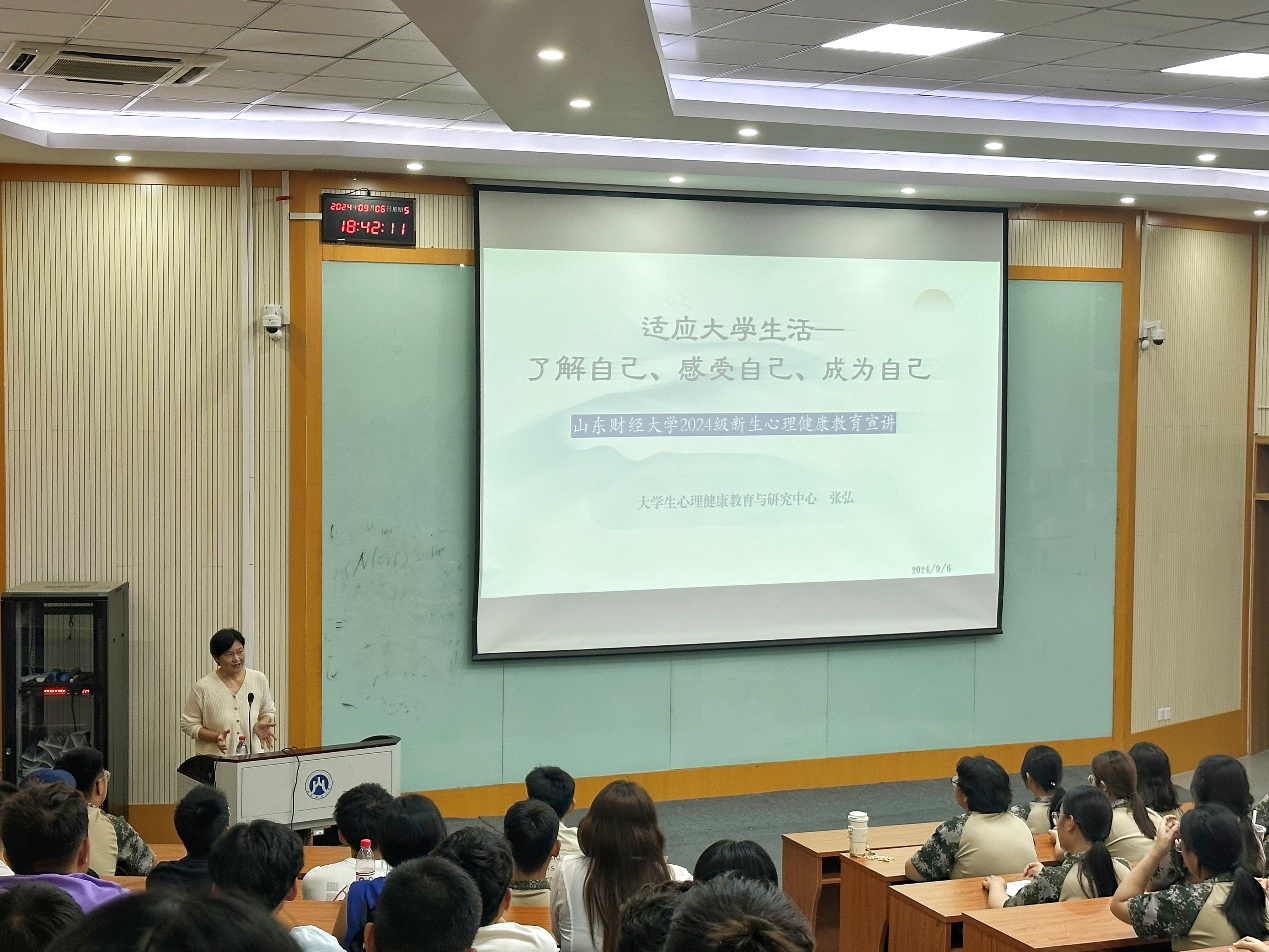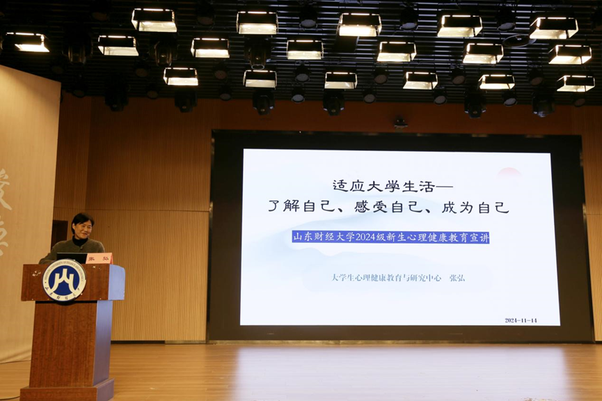 (通讯员:范嘉颖 戴悦偲)为贯彻落实《全面加强和改进新时代学生心理健康工作专项行动计划(2023-2025年)》要求,引导学生正确认识自我,提升情绪管理能力,更好地适应大学生活,新葡的京集团350vip于9月6日晚上、11月14日晚上分别在舜耕校区第三阶梯教室和圣井校区文化活动中心报告厅举办心理健康教育讲座,讲座特邀新葡的京集团350vip大学生心理健康与研究中心副主任、国家二级心理咨询师张弘主讲,新葡的京集团350vip2024级全体学生参加。