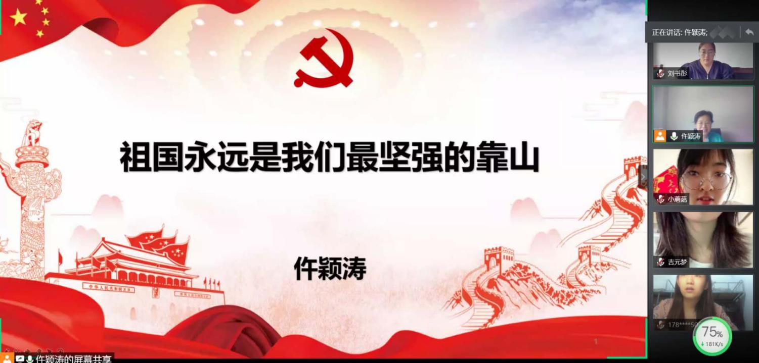 (通讯员:孙影)2020年6月30日下午,新葡的京集团350vip学生第六党支部通过腾讯会议平台开展“祖国永远是我们最坚强的靠山”专题党课。本次党课由院党委副书记仵颖涛主讲,学生第六党支部全体党员参加。