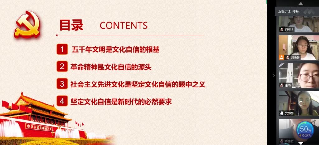 齐杨从文化的概念开始,通过中华五千年文明、革命精神、社会主义先进文化和新时代的必然要求等四个方面全面而深刻的阐释了中国抗“疫”精神中体现的文化自信。新冠肺炎疫情爆发后,全国人民团结一心及搬家式驰援体现出了中华民族“同舟共济、守望相助”的传统文化精神;医护人员告别亲友,义无反顾,硬核式支援彰显出了中国共产党“勇于担当、甘于奉献”的革命文化精神。中国共产党和中国人民在抗疫中坚持的“党的领导、人民至上、守正创新”,正是社会主义先进文化的核心。中国人民在抗“疫”中彰显的无畏精神,不仅传承了传统文化的道德精神,也融合了革命文化的精神内涵,已成为新的中国精神。随后她通过中国在全球抗“疫”中的一系列行动,阐明了我国政府在抗疫中的大国力量和大国担当,也进一步体现了文化自信的丰富意蕴。随后,齐杨结合学校、学院积极响应落实疫情防控工作的情况,列举了在疫情期间线上教学活动、新建在线资料库等情况,说明师生一起积极创新,借助线上新媒体优势,保障课程稳定进行。这也充分证明了大疫当前中华民族强大文化自信的精神伟力。最后,齐杨号召我们谨记习总书记的指示“实现中国梦必须弘扬中国精神”, 将个人理想信念与家国使命紧密结合,学生党员更要树立坚定的文化自信,在中华民族伟大复兴的进程中实现青春价值。