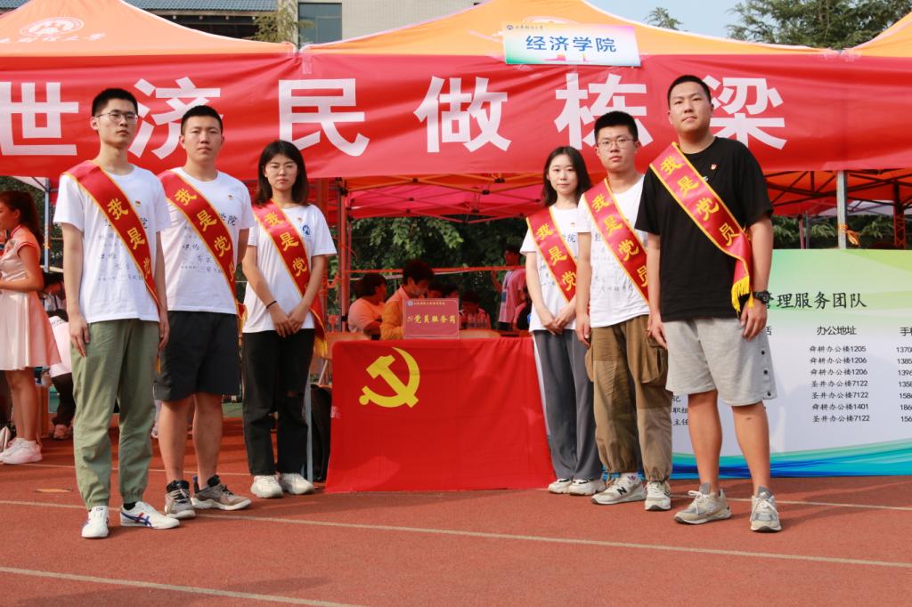 新葡的京集团350vip党委从学生党支部中选取11位党员代表组成党员服务队。党员们佩戴党徽,身着绶带,亮明党员身份,在迎新现场为新生和新生家长服务。向他们介绍学校入党条件标准、党员发展程序步骤等,并发放学院宣传材料,协助引领入住宿舍,传递了新葡的京集团党员敢为人先、甘于奉献的精神。